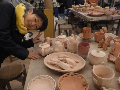 素焼きで焼き上がった自分の作品を嬉しそうに眺めていたオオダコ。急須や壺、れんげなど、今までより難しい陶芸にチャレンジしてきました。これからこの作品たちは登り窯で焼かれます。