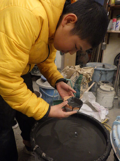 ヤタは自分の作品を慎重な面持ちで釉掛けしています。今までの経験の中で感じ取ってきた釉の特徴や色がわかるからこそ、「松の釉は流れやすいから少なめに」とさらにこだわった作品づくりができます。