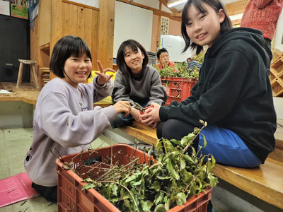 みんなで森へ行き、たくさんのソヨゴを集めました。今年度盛んに取り組んできた染め物の集大成に、泰阜村のソヨゴを使って全員でおそろいの染め物にチャレンジします。