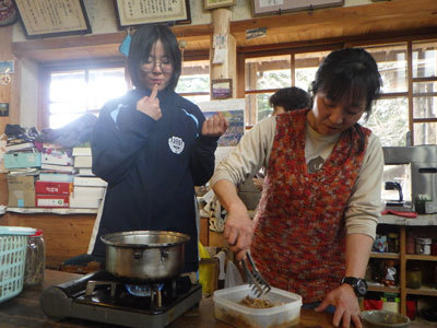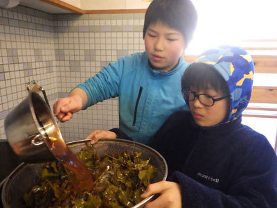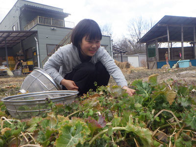 畑のチリメン冬菜を収穫する仲っちゃん。春過ぎまで育つチリメン冬菜はだいだらぼっちの冬春に大活躍の食材です。採れたてを調理して夜ご飯で食べました。