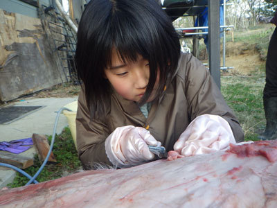 村の方からいただいた鹿の皮をなめしている2年目ののは。捌いて食べるだけではない、新たなチャレンジが広がっています。