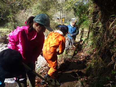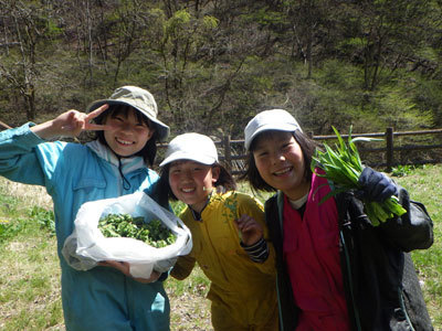 作業後に川の近くに生えている山菜を摘みました。コゴミや甘草など、春ならではの食べ物を味わいます。