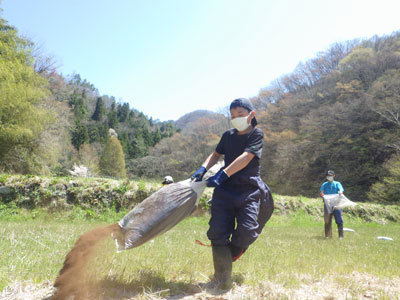 水路掃除の後は、田んぼに肥料を撒きました。疲れてきたけど、もうひと踏ん張り!最後まで集中してやりきりました。