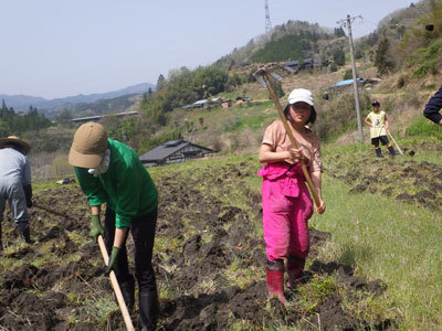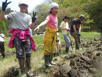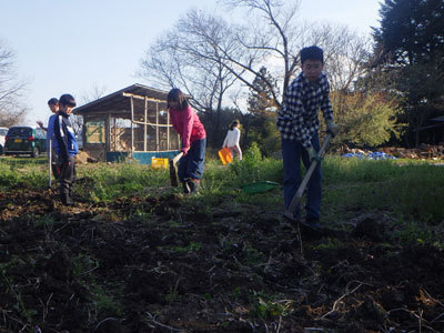 話し合いで決めた作物を植えるために畑をおこしました。初めて農具を使うこどもも教えてもらいながら頑張りました。