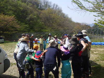田んぼ作業の中でも最も大変と言っても過言ではない田起こしに向けて相談員も応援にきてくれた家族もこどもたちも一緒になって気合を入れます。