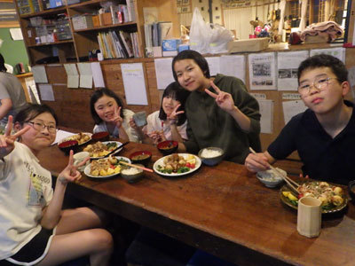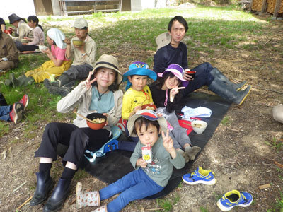なんとか作業もおわり、ちょっと遅めのお昼ごはんをみんなで食べました。こどもも大人も、たくさん働いて、一緒にごはんを食べる。これがだいだらぼっちの大家族です。