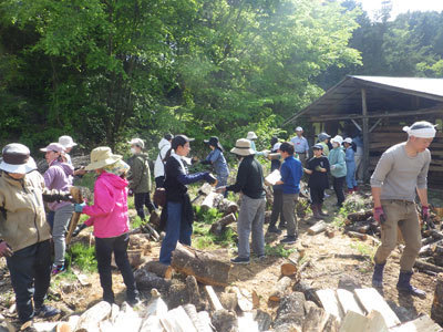 ゴールデンウィーク合宿2日目、薪作業が始まりました。冬に備えて1年分の薪を準備するために保護者やだいだらぼっち卒業生など、たくさんの人が集まり力を合わせて働きます。