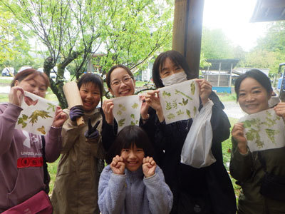 3日目は作業のお礼に泰阜村の春を楽しんでもらおうと企画した『村探検』。草木をたたいて布を染めるチームでは、「簡単にできた!」「こんなにきれいに染まるなんて!」と大好評。「頑張って準備してよかった」とこどもたちも大喜びです。