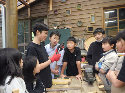 1年目のメンバーに木工などで使う刃物の使い方をレクチャーしました。自分も相手も怪我しないように、道具を正しく扱うために、2~4年目のメンバーが大事なポイントを抑えながら説明しています。