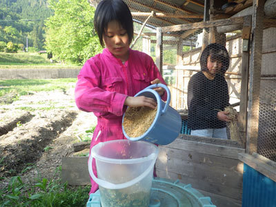 「ニワトリが卵を産まない、どうしよう」の声からニワトリの栄養状態を考え、発酵飼料作りにチャレンジしました。ニワトリの好みを探りながら心のこもったエサを作りました。