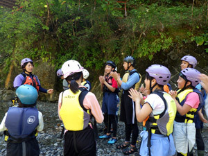 清流万古川にやってきました。まずは、セーフティートークで危ないことを確認します。川は危ない!でも何が危ないか、どうすればいいのかを考えればとても楽しい場所なんです。
