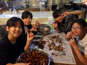 先日から続いている栗の皮むき。今回は村の方の栗の木で、たくさん採らせていただきました!「栗ご飯が食べたいな。」「栗の渋皮煮を作って、煮汁で染め物をしたい!」などなど、手仕事をしながら会話も弾みます。