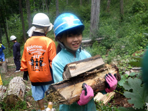 大きいままの丸太は運べないので、斧で割って運びます。丸太を割る子、運ぶ子、みんなで役割分担をして、この日の目標の量の薪を持ち帰ることができました。