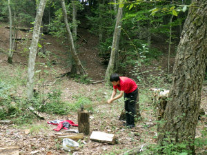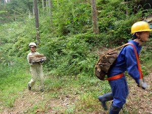 谷間から尾根にあるトラックまで、薪をせっせと運びます。力がある子は、ロープを使って肩に背負ってたくさんの量を運びました。