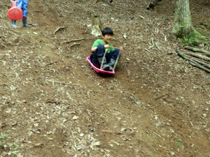 作業が終わったら、森で遊びます!斜面でのそり滑りは何度滑っても楽しいです。