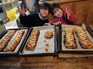 そのお祝いのケーキは前日から用意した煮リンゴでアップルパイを作りました。リンゴがこぼれずに焼き上がり大成功!美味しそうなにおいに笑顔がこぼれます。