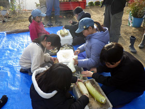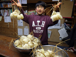 村の方から凍み大根づくりに誘っていただきました。凍み大根とは、冬の寒さを利用して作る伝統的な保存食です。つくり方の工程を丁寧に教えていただきました。こどもたちも黙々と作業をします。