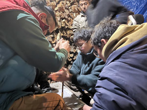 最初の着火はもみ切り式で行うことにしました。声をかけ合い、みんなの力を合わせて、火をおこします。