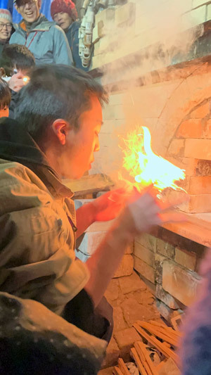 窯焚き最終日です。1200℃以上の大きな炎になりました。高温の炎を前に、薪を素早くくべるために、声をかけ合い薪をくべます。危険も伴いますが4月から積み上げてきた信頼関係があるからこそ立ち向かっていけるのです。そしてこの後、無事に焚き上げを迎えました。