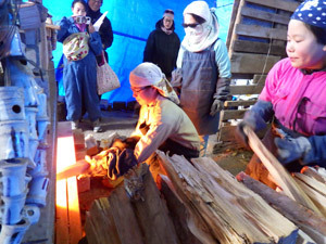 窯焚き3日目です。窯の温度は1,000度近くまで上がってきました。ものすごい熱気で怖気づきそうですが、1年目のハレも果敢に薪をくべます