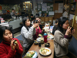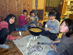 囲炉裏を使って料理してみたいと言うことで、囲炉裏に火を入れ、きりたんぽ鍋を作りました。炭火であぶったきりたんぽのおこげが最高に美味しい絶品鍋ができました。
