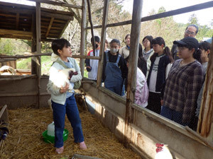 毎日の暮らしに必要な仕事は、2~5年目のメンバーから1年目のメンバーへレクチャーをします。2年目のかなにゃんはニワトリのエサやりやお世話の方法を伝えました。