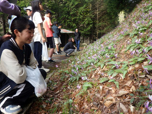 さらに、カタクリの花(村花)が咲いている場所を案内していただきました。実は、カタクリがきれいに咲くのは3日ほどしかないそう。貴重な瞬間を目の当たりにして、1年目のきのっぴも嬉しそうに眺めています。