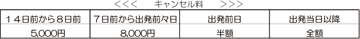 出発日の14日前から8日前は5,000円、7日前から出発前々日までは8,000円、出発前日は参加費の半額、出発当日以降のキャンセルは全額申し受けます。