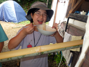 流しソーメン開始!本物の竹を使ったソーメンはおいしさ倍増です。