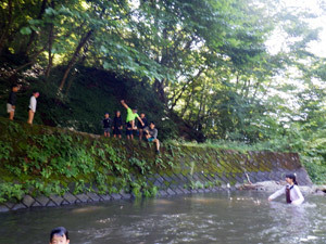 左京川へジャンプして飛び込みをしました。かっこいいポーズが決まりました。
