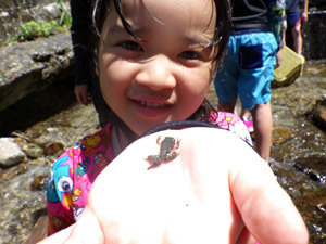 生き物探しをしていたら、オタマジャクシからカエルに変化する途中のオタマカエルを発見しました。