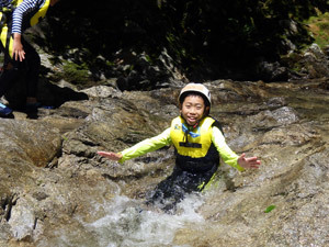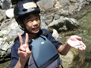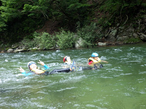前半の雨も上がり、待ちに待った川遊びです。一つ目の川、清流和知野川で流れに身を任せ流されて遊びます。冷たくて気持ちいい!