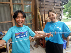 こちらは懐かしいブンブンゴマです。ちょうどいい木を輪切りにして作りました。