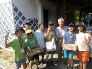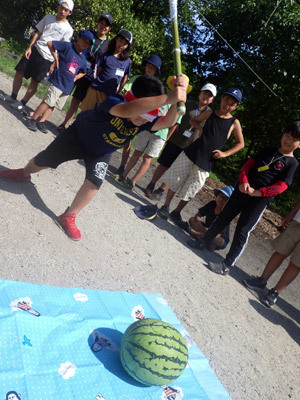 村のおじいちゃんの作ったスイカでスイカ割り!仲間のサポートで見事割ることができました。