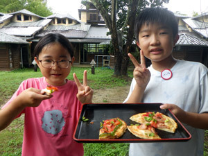 雨が降った日に行ったのはピザづくりです。薪窯に火を入れて焼き上げました。生地から手作り。アツアツで美味しい!