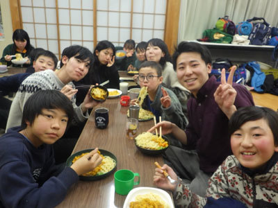 ご飯が完成!お昼の地域探検で、地区の方にお裾分けしていただいた食材も使って料理をしました。地域の温かさも感じられました。