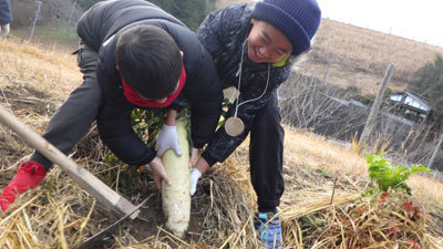 近くの農家さんのところに晩御飯の食材、大根を取りに行きました。受け取りに行くだけかと思いきや、畑から抜かせてもらうことに!大きな大根は2人がかりでも抜くのが大変でした!