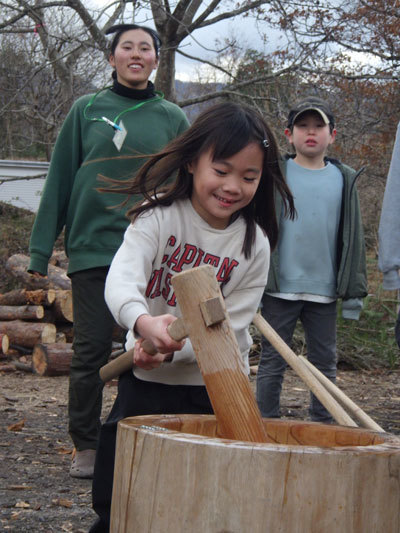 「1・2・3・・・。」みんなで声を掛け合って、お餅につきました。協力してついたお餅はおいしいね!